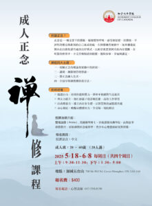 2025 BCC Admission Brochure 加拿大佛學院招生簡章 April 22, 2025 BCC 2025 BCC Admission Brochure 加拿大佛學院招生簡章 Click image to open brochure More News Emotional Balance Through Mindfulness Practice Sep 3, 2025| Trent University Plaque Unveiling Mark a Historic Day Trent大學與加國五台山隆重舉行掛牌儀式 Sep 1, 2025| Buddhist College of Canada Hosts Its 2nd Annual Open House Jun 9, 2025| Adult Mindfulness Chan Course 成人正念禪修課程 May 2, 2025| Free Beginner Level Mandarin Course May 2, 2025| 加拿大佛教學院&Trent大學推出成人正念禪修微證書課程 Apr 26, 2025| More Posts 更多信息