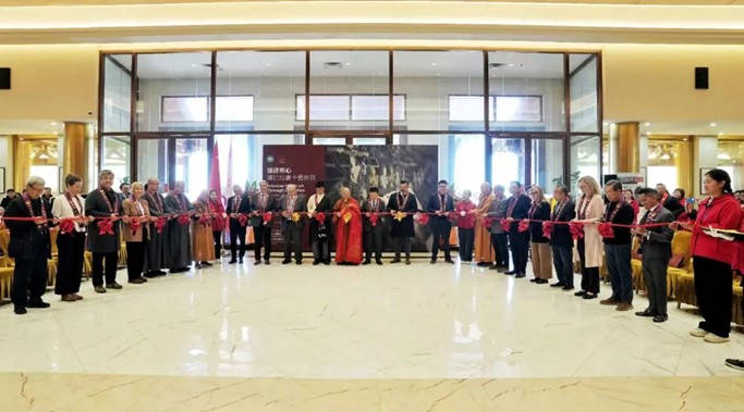 達義大和尚與二十餘位三級政要、諸山長老、社會賢達和眾多嘉賓一起為唐卡藝術展剪彩